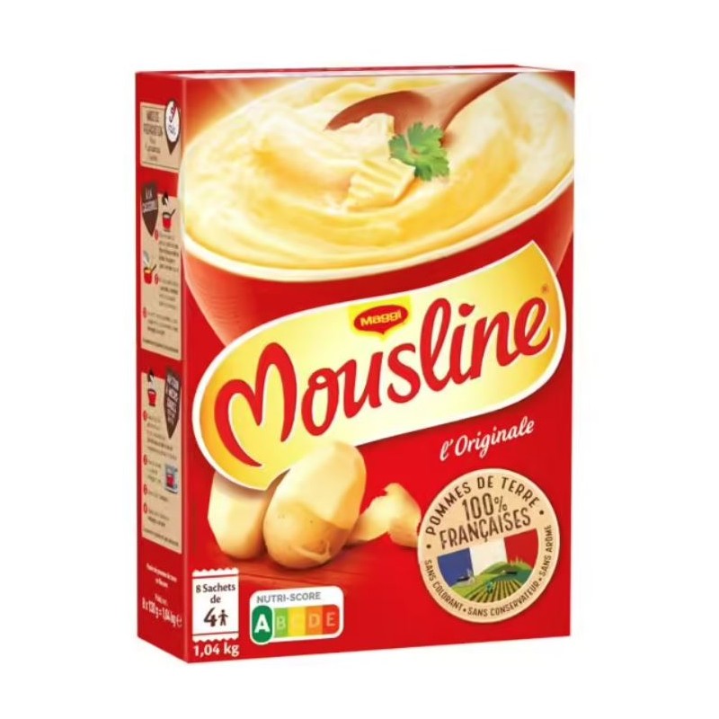 Ranskalaisten suosikkiperunamuusi. Kermainen, ainutlaatuisen makuinen muusi, joka on valmistettu 99 % ranskalaisista perunoista. Perunat, jotka on pääosin korjattu Picardiessa, toimitetaan MOUSLINEn tuotantolaitokseen. Ne pestään, kuoritaan ja höyrytetään huolellisesti. Sitten ne muussataan soseeksi, josta vesi uutetaan hiutaleiksi. Ei väriaineita. Ei säilöntäaineita. Ei aromeja. Valmistettu Picardiessa. Kierrätettävää pahvia. Yksi pakkaus sisältää 8 pussia 4 hengelle.