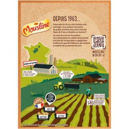 MOUSLINE-kerma-muskottipähkinäsoseemme on valmistettu 90-prosenttisesti perunasta. Ranskalaiset perunat, jotka korjataan pääosin Picardiessa, toimitetaan MOUSLINE-tuotantolaitokseen. Ne pestään, kuoritaan ja höyrytetään huolellisesti. Sitten ne muussataan soseeksi, josta vesi uutetaan hiutaleiksi. Sitten lisätään kerma ja muskottipähkinä, jolloin lopputuloksena on kermainen sose, jolla on ainutlaatuinen maku. Valmistettu Picardiessa. Kierrätettävää pahvia. Yksi pakkaus sisältää 3 pussia kahdelle hengelle.