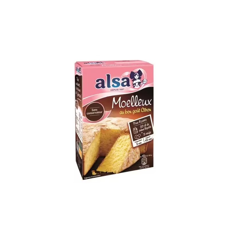 Alsa – Sitruunakakkumix 435 g – Nopea ja helppo kakkumix Runsas ja ainutlaatuisen mehevä sitruunakakku. Lisää vain 20 cl kermaa ja 3 kananmunaa, ripottele päälle tomusokeria ja laita uuniin ilahduttamaan kaikkia makeansyöjiä. • Ilmava koostumus tekee kakusta uskomattoman mehevän; • Herkullinen sitruunan maku; • Helppo, nopea ja varma jälkiruoka; • Riittää 8 hengelle; • Säilöntäaineeton.