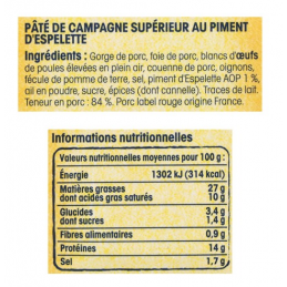 Sian kurkku, sianmaksa, kananmunanvalkuaiset (vapaana pidetyistä kanoista), sian nahka, sipuli, perunatärkkelys, suola, 1 % Espelette SAN -pippuria, valkosipulijauhe, sokeri, mausteet (mukaan lukien kaneli).