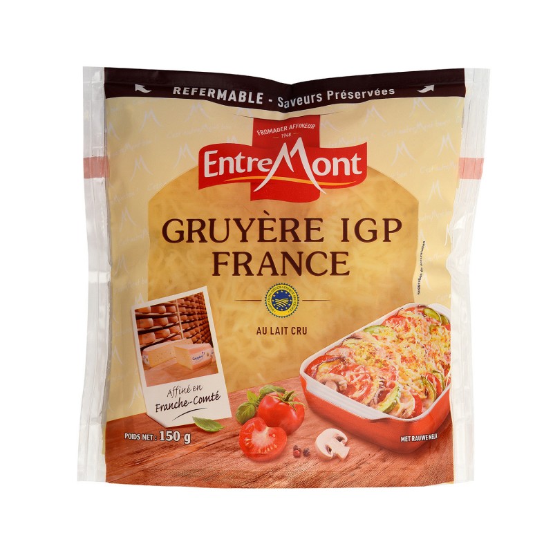 Tätä Gruyère France Entremont -juustoa kypsytetään vähintään 120 päivää kellareissamme Franche-Comtén sydämessä. Ainutlaatuinen maku ja runsaasti sulava koostumus parantavat ruoanlaittoasi. Se on eri tavalla hyvää !