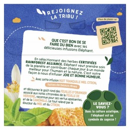 Nauti makeista unista Tranquil Night Honey Lemon -uutteella ja sen 20 Pyramid®-pussilla ja löydä appelsiininlehtien pyöreä maku yhdistettynä rauhoittavista ominaisuuksistaan tunnetun verbenanlehden ja kamomillan sitruunaisiin vivahteisiin. Kaikkea tätä täydentää hunajan ja sitruunan makeus. Valitsemalla Rainforest Alliance -sertifioituja yrttejä Elephant haluaa huolehtia planeetasta ja osallistua joka päivä paremman maailman luomiseen ihmisille ja luonnolle. Se on meidän tapamme tuoda iloa ja hyvää huumoria. Uutteemme salaisuus? 100 % sen ainesosista on luonnollista alkuperää. Juuri sinua varten Elephant on valinnut huolella kasveja tarjotakseen sinulle tämän Well-Being-sarjan. Ihanteellisen makuelämyksen saat antamalla Pyramid®-uuttepussin hautua 4–5 minuuttia 200 ml:ssa kuumaa vettä ja nauttimalla. Elephantin seikkailu alkoi vuonna 1896 ja jatkuu tänäkin päivänä. Tämä, sikäli kuin elefantit muistavat, on melkoinen kokemus uutteiden luojalle... Hänen suurin ilonsa on aina ollut makunystyröidemme kiihottaminen! Elephant tekee luonnon kuuntelemisesta todellisen voiman, jota hän käyttää valitakseen parhaat kasvit ja valmistaakseen herkullisia, ainutlaatuisia haudukkeita, joita kaikki arvostavat. Mutta älkää erehtykö, Elephant*, ranskalaisten suosikkimerkki, lisää anteliaisuudessaan myös ystävällisyyttä, yksinkertaisuutta, ripauksen huumoria ja ripauksen omaperäisyyttä. Liity siis joukkoomme ja tutustu kaikkiin muihin herkullisiin resepteihin Well-Being-valikoimastamme. *Elephant, arvo- ja volyymijohtaja Ranskassa — Nielsen vuonna 2022