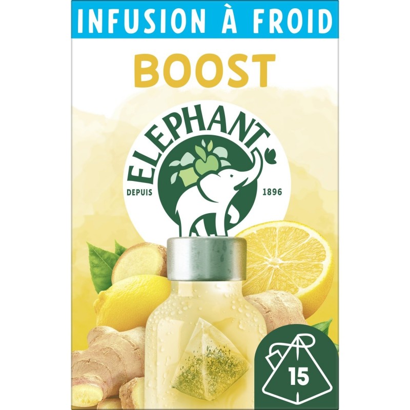 15 Pyramid® Elephant Lemon Ginger Boost -kylmähaudukepussin avulla mausta vetesi luonnollisesti ja hemmottele itseäsi herkullisella ja virkistävällä hyvinvoinnin hetkellä! Anna itsellesi pieni piristysruiske tällä Boost-kylmähaudukkeella ja löydä sitruunan kirpeän ja virkistävän maun sekä inkiväärin juuren mausteisten vivahteiden yhdistelmä, joiden tiedetään lisäävän elinvoimaa. Valitsemalla 100 % luonnollista alkuperää olevia ainesosia, jotka vapauttavat kaikki arominsa jopa kylmässä vedessä, Elephant kutsuu sinut nauttimaan hedelmäisen raikkauden purskahduksesta mihin aikaan päivästä tahansa. Se on meidän tapamme tuoda iloa ja hyvää huumoria. Elephant Cold Infusion -reseptit koostuvat yksinomaan kasveista, hedelmistä ja luonnollisista mauista. Ne ovat sokerittomia, kalorittomia ja kofeiinittomia. Elephant on valinnut sinulle parhaat kasvit. Täydellisen makuelämyksen saavuttamiseksi anna Pyramid®-haudukepussin hautua 5 minuuttia 500 ml:ssa kylmää vettä, ravista ja nauti! Koska rakastamme planeettaamme, ei enää muovikelmua. Laatikkomme ovat kierrätettäviä ja valmistettu kestävästi hoidetuista metsistä peräisin olevasta pahvista. Sisäpakkaus on valmistettu puumassasta, jota voidaan kompostoida kotona. Entäpä pussimme? Kaikkien pakkaukseksi ne ovat kasvipohjaisia ja pinnoittamattomia. Elephant-seikkailu alkoi vuonna 1896 ja jatkuu tänäkin päivänä. Se, niin pitkälle kuin elefantit muistavat, on melkoinen kokemus haudukkeiden luojalle... Hänen suurin ilonsa on aina ollut makunystyröidemme innostaminen! Elephant tekee luonnon kuuntelemisesta todellista voimaa, jota hän käyttää valitakseen parhaat kasvit ja hedelmät ja valmistaakseen herkullisia, ainutlaatuisia haudukkeita, joista kaikki nauttivat. Mutta älkää erehtykö, Eléphant*, ranskalaisten suosikkimerkki, lisää suuressa anteliaisuudessaan myös ystävällisyyttä, yksinkertaisuutta, ripauksen huumoria ja ripauksen omaperäisyyttä. Liity siis joukkoon ja tutustu kaikkiin muihin herkullisiin resepteihin Cold Brew -valikoimastamme. *Eléphant, hinta-laatusuhteeltaan ja määrältään johtava toimija Ranskassa — Nielsen vuonna 2022
