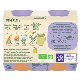 Ainesosat: Yksi pieni porkkana* 44,0 % - 1 pala bataattia* 22,0 % - Keittövesi - Hieman keitettyä bulguria* 12,0 % (GLUTEENI) - Kasviöljyt* (rypsi, auringonkukka). *Luomuviljelytuotteita.