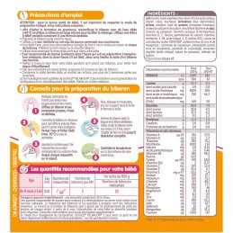 Ainesosat: Rasvaton MAITO, kasviöljyt (runsaasti öljyhappoa sisältävä auringonkukka-, kookos-, rapsi- ja auringonkukkaöljy), demineralisoitu makea HERA, LAKTOOSI, tärkkelys, KALAöljy, trikalsiumfosfaatti, kalsium- ja natriumsitraatit, emulgointiaine (SOIJAlesitiini), kaliumkloridi, maitohappobakteerit (S. thermophilus), vitamiinit (C, E, niasiini, kalsiumpantotenaatti, tiamiini, riboflaviini, A, B6, foolihappo, K, D, biotiini, B12), Lactobacillus reuteri -viljelmä DSM17938*, rauta-, sinkki- ja mangaanisulfaatit; magnesiumkarbonaatti, antioksidantit (tokoferolirikas uute, L-askorbyylipalmitaatti), happamuudensäätöaine (sitruunahappo), kaliumjodidi, natriumselenaatti. *Biogaia AB:n lisenssillä.