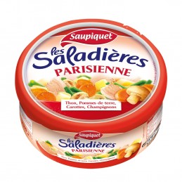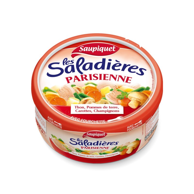 Saupiquet'n Parisienne-salaattikulho on herkullinen tonnikalan, kuutioitujen perunoiden, porkkanapalojen, kokonaisten sienten ja vihreiden papujen kanssa. Se on helppo ottaa mukaan minne tahansa uudelleensuljettavan kannen ansiosta.