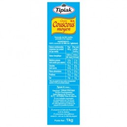 TIPIAK Medium Couscous -kuskusjyvää on aina valmistettu valssatusta, höyrytetystä, kuivatusta ja siivilöidystä durumvehnäjauhosta, jolloin syntyy pehmeää, kevyttä ja maukasta jyvää. Nopea ja helppo valmistaa, se sopii täydellisesti lihan, kalan ja kasvisten kanssa päivittäin. Se on myös ihanteellinen jyvä herkullisen tabboulehin tai perinteisen kuskusruoan valmistukseen.