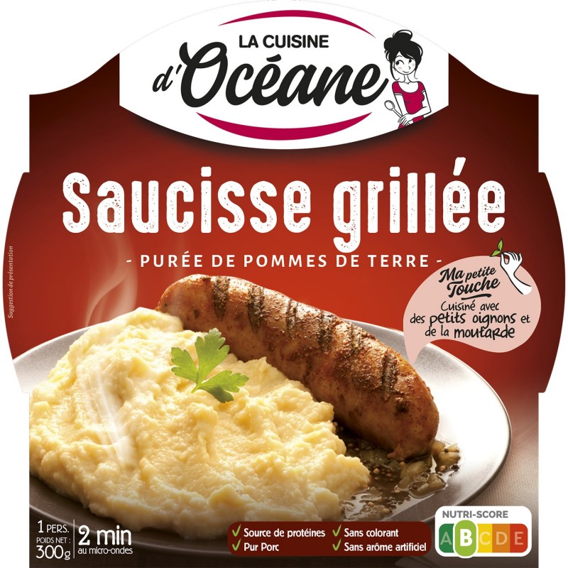 Océane on valinnut teille grillatun puhtaan sianlihamakkaran, tarjoillaan kevyen sinappi- ja sipulisiivukastikkeen kera. Maukkaaksi ja tasapainoiseksi annokseksi hän tarjoaa herkullista perunamuusia, joka on valmistettu perinteisellä tavalla ripauksella crème fraîchea.