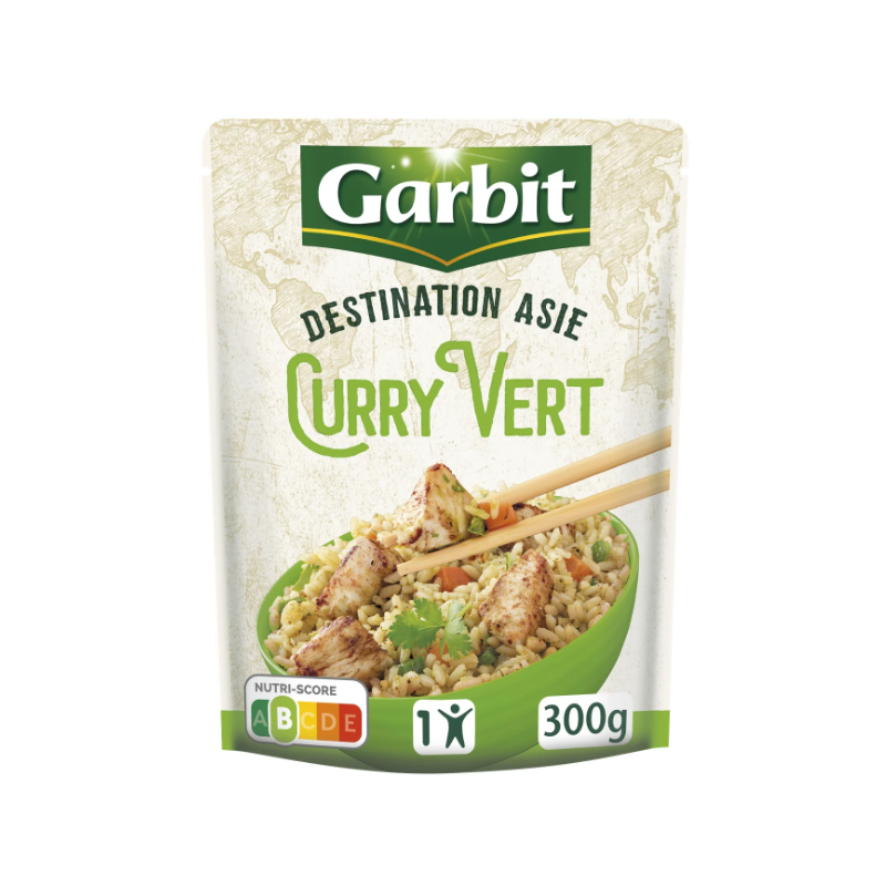 Valmis vihreä curryruoka pitkällä riisillä ja maustetulla kanalla GARBIT