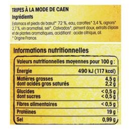 Naudan mahat ja jalat* 72 %, vesi, porkkanat* 3,4 %, sipulit* 2,7 %, maustettu viini, suola*, calvados*, paprika, mauste- ja aromaattiset kasviuutteet, happamuudensäätöaine: sitruunahappo, valkosipuli. *Alkuperämaa: Ranska.