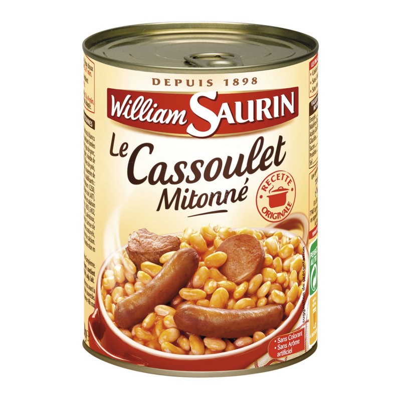 AINESOSAT: Esikypsennetyt valkoiset pavut (33 %), vesi, savustetut makkarat ja salami (sianliha ja -rasva, vesi, sianpää, kalkkunanliha, VEHNÄjauho, hernekuitu, suola, SOIJAproteiini, siannahka, hyytelöimisaine: prosessoitu Euchema-levä, stabilointiaineet: difosfaatit, polyfosfaatit; jäämiä MAITOproteiinista), suolattu sianlapa (sianlapa, vesi, suola, stabilointiaineet: trifosfaatit, polyfosfaatit), sianrasva, kolminkertainen tomaattitiiviste, VEHNÄjauho, suola, sokeri, luontaiset aromit, kiinteyttämisaine: kalsiumkloridi.