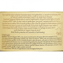 Lingot-pavut 29 %, vesi, luuttomat, suolatut porsaanpotkat 23,5 % (luuttomat porsaanpotkat [équivalent viande crue mise en œuvre : 20%] , vesi, suola, luontainen pippuriaromi), grillattu Toulouse-makkara 11,9 % (sianliha, porsaanrasva, suola, pippuri, luontainen pippurisuoli), luulliset porsaan kylkiluut, kypsennettynä ankanrasvassa 7,1 % (porsaan kylkiluut, ankanrasva), porsaan nahka, ankanrasva, purjo, valkosipulimassa (valkosipuli, suola), porsaanrasva, porkkanat, sipulit, lihaliemi, luontaiset pippuriaromit, tomaatti, persilja, timjami, laakerinlehti, suola, muskottipähkinä, korianteri, salvia, inkivääri, kaneli, neilikka, oregano, luontainen aromi. Sianliha: alkuperämaa Ranska. 99 % näistä ainesosista on Ranskasta peräisin.