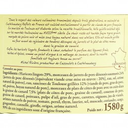 Lingot-pavut 29 %, vesi, luuttomat, suolatut porsaanpotkat 23,5 % (luuttomat porsaanpotkat [équivalent viande crue mise en œuvre : 20%] , vesi, suola, luontainen pippuriaromi), grillatut Toulouse-makkarat 11,9 % (sianliha, porsaanrasva, suola, pippuri, luonnollinen porsaankuori), luulliset porsaan kylkiluut, kypsennettynä ankanrasvassa 7,1 % (porsaan kylkiluut, ankanrasva), porsaan nahka, ankanrasva, purjo, valkosipulimassa, porsaanrasva, porkkanat, sipulit, lihaliemi, luontaiset pippuriaromit, tomaatti, persilja, timjami, laakerinlehti, suola, muskottipähkinä, korianteri, salvia, inkivääri, kaneli, neilikka, oregano, luontainen aromi. Sianliha Ranskasta. 99 % näistä ainesosista on Ranskasta peräisin.