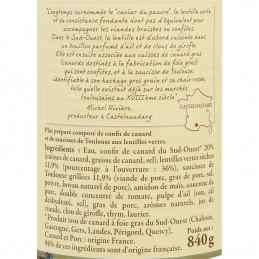 Vesi, konfitoitu ankka Lounais-Ranskasta* 20 % (ankan koivet, ankanrasva, suola), kuivatut vihreät linssit 11,9 % (prosenttiosuus avattuna: 36 %), grillatut Toulousen makkarat 11,9 % (sianliha, sianrasva, suola, pippuri, luonnollinen siankuori), maissitärkkelys, siannahka, tuplatomaattitiiviste, valkosipulimassa (vesi, kuivattu valkosipuli, suola), sianrasva, luontaiset aromit, lihaliemi, neilikka, timjami, laakerinlehti. *Tuote on valmistettu Lounais-Ranskasta (Chalosse, Gascony, Gers, Landes, Périgord, Quercy) peräisin olevasta hanhenmaksanankasta. Ankka ja sianliha: alkuperämaa Ranska. 96 % näistä ainesosista on Ranskasta peräisin.