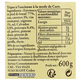 Naudan vatsa ja jalat 77 %, vesi, porkkanat 3 %, maustettu viini, sipuli 1 %, suola, calvados 0,8 %, purjo 0,4 %, valkosipuli, pippuri, paprika, cayennepippuri, laakerinlehti, neilikka, timjami. 98 % ainesosista on ranskalaista alkuperää.