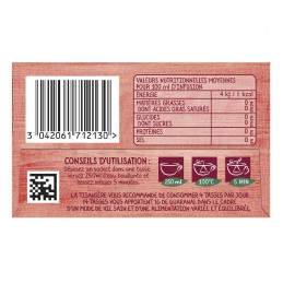 Ingredienti: Menta piperita* (43%), Cannella* (27%), Guaranà* (17%), Liquirizia* (9%) e Aroma naturale (5%). *Queste piante provengono da agricoltura biologica.