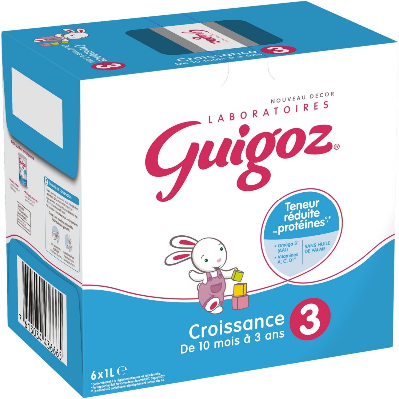 For hva GUIGOZ Vekst? Inspirert av 60 års forskning på morsmelk har Guigoz Laboratories utviklet GUIGOZ® Growth, for å dekke babyens ernæringsbehov mellom 10 måneder og 3 år, som en del av et variert kosthold: - Redusert proteininnhold: nesten 2 ganger mindre protein enn kumelk*. - Alfa-linolensyre (ALA**), en essensiell fettsyre fra Omega 3-familien, som bidrar til normal utvikling av hjerne- og nervevev. - Vitamin A** og C**, som bidrar til immunsystemets normale funksjon. - Vitamin D**, som bidrar til normal utvikling av bein og tenner. Visste du at? Fra 6 måneder spiser de fleste spedbarn mer protein enn de trenger***. Snakk med legen din. *Ciqual 2017. UHT lettmelk fra kumelk. **I samsvar med forskriftene om oppfølgingsmelk. ***EFSA Journal 2014;12(7):3760