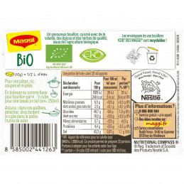 Ingredienser: Matsalt, potetstivelse*, sukker*, glukosesirup*, fjærkre* 4,2 % (kokt kyllingkjøtt* 3,2 %, kyllingfett*, antioksidant: rosmarinekstrakter*), sheasmør*, gjærekstrakt*, naturlig kyllingsmak, løk* 1,3 %, hvitløk*, persille* 0,3 %, gurkemeie*, naturlig løkaroma, sort pepper*. *Fra økologisk landbruk. Kan inneholde: SELLERI, EGG, FISK, GLUTEN, MELK, SOYA.