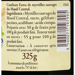 Ville blåbær fra Massif Central, sukker, geleringsmiddel: pektiner, surhetsregulerende middel: sitronsyre. Laget med 50 g frukt per 100 g ferdig produkt. Totalt sukkerinnhold: 55 g per 10 g ferdig produkt.