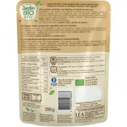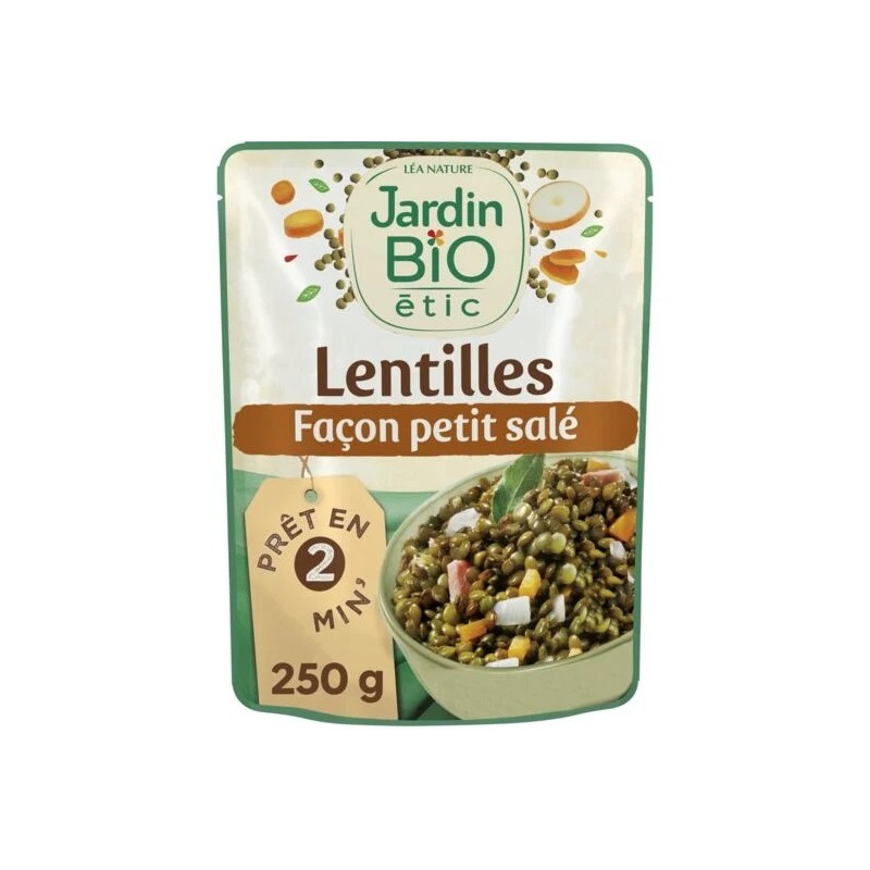 Fordi tiden din er dyrebar, og det samme er kostholdet ditt, tilbyr Jardin BiO étic deg originale økologiske ekspressmenyer som er klare på bare noen få minutter. Denne oppskriften inviterer deg til en gourmetreise med lokale smaker: en deilig blanding av grønne linser ledsaget av små løk, gulrøtter, urter og skinkebiter, som du kan nyte som du vil, som hovedrett eller som tilbehør. Vel bekomme!