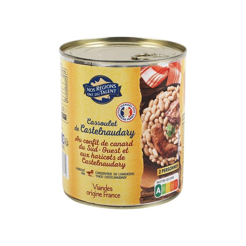 Castelnaudary-bønner PGI 33 %, vann, grillede Toulouse-pølser 16 % (svinekjøtt, svinefett, vann, naturlig svinetarm, salt, pepper), confitert andekjøtt fra sørvestregionen* 16 % (biter av andelår fra sørvestregionen*, salt), andefett, hvitløksmasse (hvitløk, salt), dobbeltkonsentrert tomatpuré, naturlig aroma, salt, pepper. Svinekjøtt og and fra Frankrike. *PGI And med foie gras fra sørvestregionen (Chalosse, Gascogne, Gers, Landes, Périgord, Quercy).
