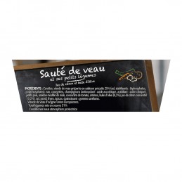 Grønnsaker (51 %): gulrøtter, squash, sopp (antioksidant: askorbinsyre, surhetsregulerende middel: sitronsyre), erter. Kjøtt: Forkokt, spekemat av kalv (25 %): salt, stabilisatorer: E451, E452. Saus: vann, bearbeidet maisstivelse, aromaer, olivenolje (0,3 %), konsentrert sitronsaft (0,2 %), salt, timian, fortykningsmiddel: xantangummi, krydder, smaksforsterker: E63.