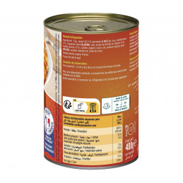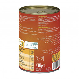 Vann, ravioli 28,5 % (durumhvetesemule, vann, storfekjøtt 5 %, brødsmuler (inkludert GLUTEN), salt), halvredusert tomatpuré 14 %, storfekjøtt 10 %, gulrot, løk, sukker, salt, krydderekstrakter (inkludert SELLERI), bearbeidet stivelse, rapsolje. Storfekjøtt fra Frankrike. Spor av MELK og EGG.
