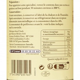 Lingotbønner 34,5 %, vann, biter av konfiterte fete andelår 20 % (fete andelår, andefett, salt), grillede Toulouse-pølser 12,5 % (svinekjøtt, svinefett, salt, pepper, naturlig svinetarm), svinesvor, andefett, purre, hvitløksmasse (vann, tørket hvitløk, salt), svinefett, gulrøtter, løk, kjøttsaft, naturlige peppersmakstilsetninger, tomat, persille, timian, laurbærblad, salt, muskatnøtt, koriander, salvie, ingefær, kanel, nellik, oregano, naturlig aroma. And og svinekjøtt med opprinnelse i Frankrike. 99 % av disse ingrediensene er av fransk opprinnelse.