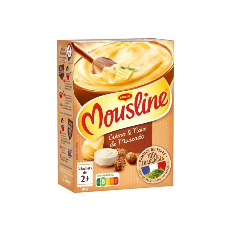 Vår MOUSLINE-krem- og muskatnøttpuré er laget av 90 % potet. Franske poteter, hovedsakelig høstet i Picardy, leveres til MOUSLINEs produksjonsanlegg. De vaskes nøye, skrelles og dampes. Deretter moses de til en puré, hvorfra vannet ekstraheres for å redusere den til flak. Fløte og muskatnøtt tilsettes deretter, noe som resulterer i en kremet puré med en unik smak. Produsert i Picardy. Resirkulerbar papp. Én eske inneholder 3 poser til 2 personer.