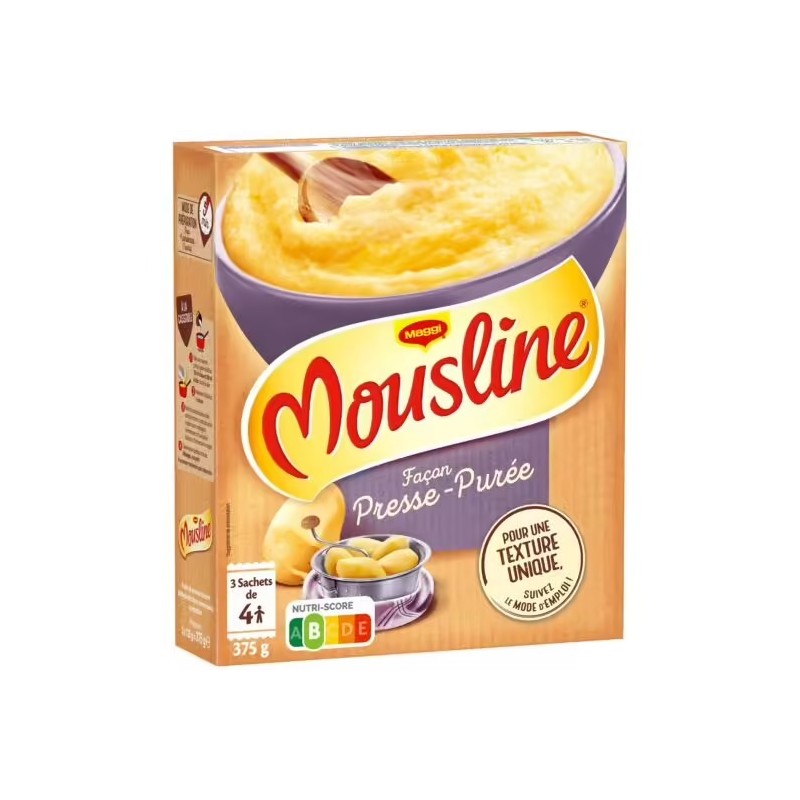 Oppdag en puré med en unik tekstur, med små biter som smelter i munnen. Med mer enn 87 % potet tilbyr MOUSLINE Façon Presse-Purée deg en puré for hele familien, glatt og deilig, som vil minne deg om smaken av poteter som delikat kjøres gjennom en potetpresse. Én eske inneholder 3 poser til 4 personer.