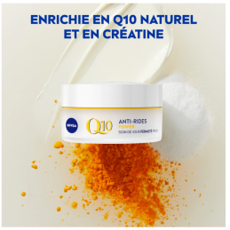 Formelen til NIVEA Q10 POWER Anti-Wrinkle and Firming Day Care SPF 15 inneholder naturlig kreatin og koenzym Q10 av høy kvalitet for en dobbel 24-timers antirynkevirkning:. Beskytter celler mot frie radikaler og ytre aggresjoner, som er ansvarlige for hudens aldring. Gjenoppretter energi til cellene og hjelper huden med å regenerere seg. Pleien reduserer synlig rynker og forhindrer at de forekommer. Ved å inneholde SPF 15 beskytter den huden mot UVA/UVB-stråler, som er ansvarlige for for tidlig hudaldring. Huden blir næret, oppstrammet, og mimikklinjene glattes synlig ut.