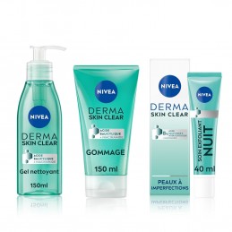NIVEA Derma Skin Clear Daily Night Scrub er formulert med en høy konsentrasjon av salisylsyre, glykolsyre og niacinamid. Den støtter hudens naturlige fornyelsesprosess og bidrar til å fjerne døde hudceller og åpne tette porer, noe som reduserer ujevnheter og forhindrer at de kommer tilbake. Huden blir klarere og hudtonen jevnere på bare 7 dager.