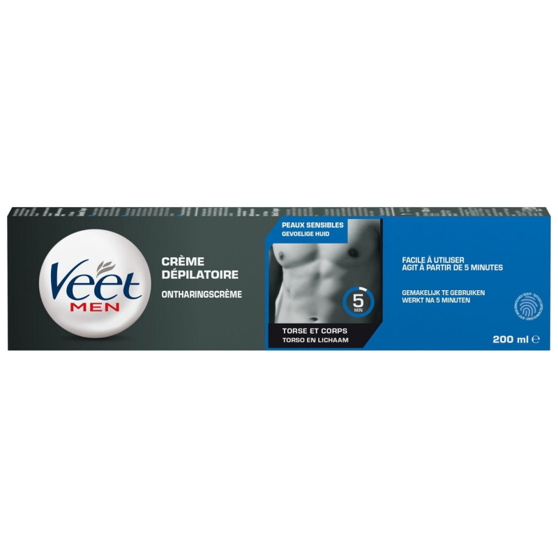 Oppdag Veet hårfjerningskrem for menn. En hårfjerningskrem for sensitiv hud, for enkel hårfjerning på bryst og kropp på 5 minutter. Mens den fjerner hår, fukter den huden i opptil 24 timer, og duften er spesielt formulert for å ikke etterlate ubehagelig lukt. 5 til 10 minutter