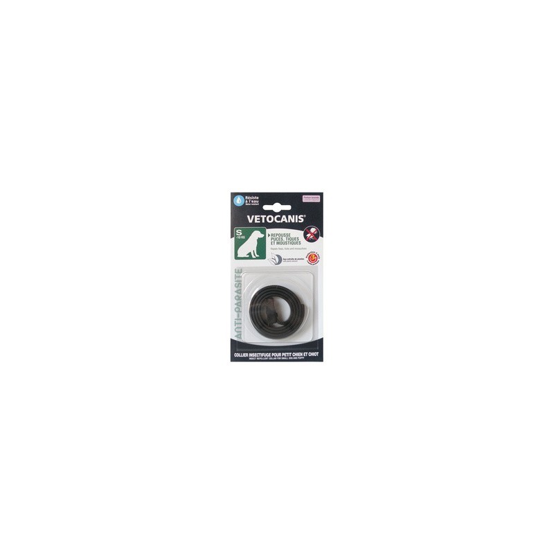Dette antiparasitthalsbåndet fra Vétocanis for små hunder og valper som veier under 10 kg, avviser lopper, flått og mygg.