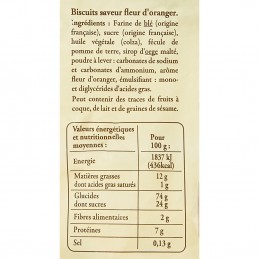 HVETEMEL (fransk opprinnelse), sukker (fransk opprinnelse), vegetabilsk olje (raps), potetstivelse, maltet BYGGsirup, hevemiddel: natriumkarbonater og ammoniumkarbonater, appelsinblomstaroma, emulgator: mono- og diglyserider av fettsyrer.