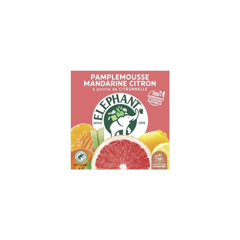 Pigg opp dagen din med den fruktige bitterheten fra grapefrukt, den runde smaken av mandarin og de forfriskende sitronnotene, alt forsterket med et delikat hint av sitrongress takket være Grapefruit Mandarin Lemon-infusjonen og dens 20 Pyramid®-teposer. Ved å velge Rainforest Alliance-sertifiserte planter og frukter ønsker Elephant å ta vare på planeten og hver dag bidra til en bedre verden for mennesker og natur. Det er vår måte å tilføre glede og godt humør. Hemmeligheten bak infusjonen vår? 100 % av ingrediensene er av naturlig opprinnelse. Bare for deg har Elephant nøye utvalgt planter og frukter for å tilby deg denne fruktige serien med en generøs smak. For en ideell smaksopplevelse, la Pyramid®-infusjonsposen trekke i 4–5 minutter i 200 ml varmt vann og nyt. Elephant-eventyret startet i 1896 og fortsetter i dag. Noe som, så vidt elefanter kan huske, er en spesiell opplevelse for en infusjonsskaper... Hans største glede har siden alltid vært å begeistre smaksløkene våre! Elephant gjør det å lytte til naturen til en ekte styrke, som han bruker til å velge de beste plantene og fruktene og lage deilige, unike infusjoner som alle setter pris på. Men ta ikke feil, Elephant*, franskmennenes favorittmerke, tilfører i sin store generøsitet også vennlighet, enkelhet, et snev av humor og et snev av originalitet. Så bli med i stammen og oppdag alle de andre deilige oppskriftene i vårt Fruity-sortiment. *Elephant, verdi- og volumleder i Frankrike — Nielsen år 2022