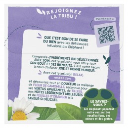 Ta det med ro og oppdag forsiktig denne blandingen av kamilleblomst, kjent for sine beroligende egenskaper, lind med sine lett honningsøte noter og appelsinblader med en delikat smak takket være Organic Relax-infusjonen og dens 20 Pyramid®-poser. Denne infusjonen gir deg all dens smak og fordeler. Det er vår måte å tilføre glede og godt humør. Hemmeligheten bak infusjonen vår? 100 % av ingrediensene er av naturlig opprinnelse. Bare for deg har Elephant nøye utvalgt planter fra økologisk landbruk for å tilby deg dette økologiske sortimentet, fullt av smak. For en ideell smaksopplevelse, la Pyramid®-infusjonsposen trekke i 4–5 minutter i 200 ml varmt vann og nyt. Elephant-eventyret startet i 1896 og fortsetter i dag. Noe som, så vidt elefanter kan huske, er en spesiell opplevelse for en infusjonsskaper... Hans største glede har siden alltid vært å begeistre smaksløkene våre! Elephant gjør det å lytte til naturen til en ekte styrke, som han bruker til å velge de beste plantene, fruktene og krydderne og lage deilige, unike infusjoner som alle setter pris på. Men ta ikke feil, Elephant*, franskmennenes favorittmerke, tilfører i sin store generøsitet også vennlighet, enkelhet, et snev av humor og et snev av originalitet. Så bli med i stammen og oppdag alle de andre deilige oppskriftene i vårt økologiske sortiment. *Elephant, verdi- og volumleder i Frankrike — Nielsen år 2022