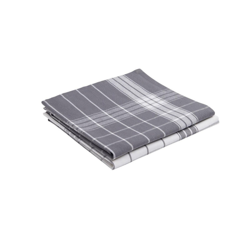 Sett med 2 rutete kjøkkenhåndklær *Farge: Grå *Mål: 50x70 cm *Sammensetning: 100 % bomull Pleieinstruksjoner: Vask på 60 °C, ikke blek, ikke tørk i tørketrommel, stryk på middels temperatur (maks. 150 °C) og ikke bruk profesjonelt vaskemiddel.