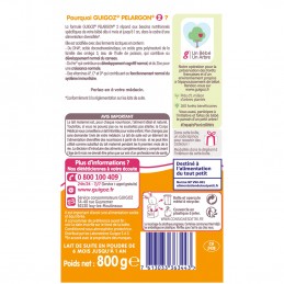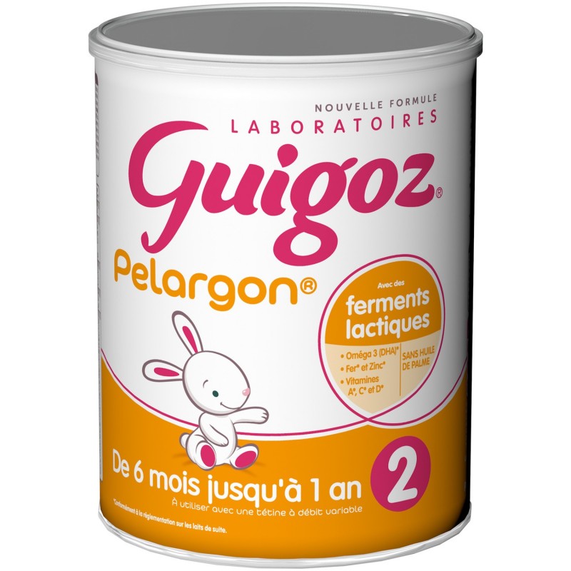 Formelen GUIGOZ Pelargon 2 dekker de spesifikke ernæringsbehovene til babyen din fra 6 måneder til 1 år, som en del av et variert kosthold*. Den er syrnet med melkesyre og inneholder: DHA*, dokosaheksaensyre, en flerumettet fettsyre fra omega-3-familien, utvunnet fra fiskeolje, som bidrar til normal hjerneutvikling. Jern* som bidrar til normal kognitiv utvikling, og sink for normal vekst. Vitamin A*, C* og D* som bidrar til immunsystemets normale funksjon. *I samsvar med forskriftene om tilskuddsmelkerstatning.