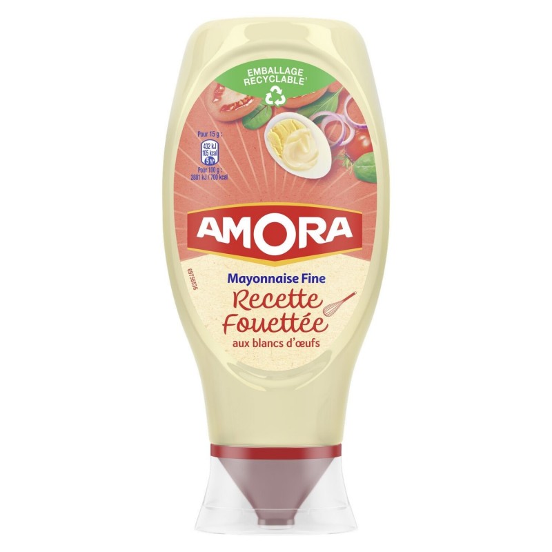 Oppdag den lette teksturen og sødmen til Amora Whipped Mayonnaise Recipe, en majones uten sennep som vil glede hele familien i en 398 g squeeze-flaske. En luftig, pisket oppskrift med eggehviter og tilberedt med kvalitetsingredienser. Del det beste: en oppskrift uten fargestoffer, laget med rapsolje og rik på Omega 3. Pisket majones som vil glede hele familien: en majonessausoppskrift uten sennep og med en lett og fin tekstur. En gourmetmajonesoppskrift som vil følge deg på piknikene dine og forbedre smørbrød, deviled eggs, kebaber og salater, elsket av både store og små. Dette krydderet kommer i en squeeze-flaske som inneholder minst 63 % resirkulert materiale. Amora har vært til stede i franskmennenes hjerter siden 1919, og er anerkjent og verdsatt for sin kunnskap og kvaliteten på produktene sine. Merket gleder hvert år med sine enkle, originale og smakfulle oppskrifter. Lag enkle og deilige oppskrifter og gjenoppfinn rettene dine ved å gi dem enda mer smak med Amora. På kanten av tallerkenen, i smørbrødene dine, eller servert varmt, vil Amora-sauser og krydder krydre alle rettene dine (salat, fisk, kjøtt, grønnsaker osv.) og forbedre smakene i matlagingen din. Oppdag gleden av å dele deilige måltider med familie eller venner. Du vil glede både voksne og barn, til glede for alle smaksløker!
