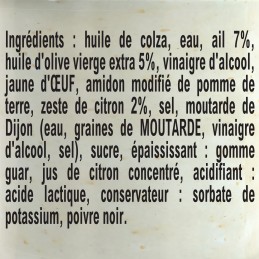 Ingredienser: rapsolje, vann, hvitløk 7 %, extra virgin olivenolje 5 %, spriteddik, EGGEplomme, modifisert potetstivelse, sitronskall 2 %, salt, Dijon-SENNEP (vann, SENNEPSFRØ, spriteddik, salt), sukker, fortykningsmiddel: guargummi, konsentrert sitronsaft, surhetsregulerende middel: melkesyre, konserveringsmiddel: kaliumsorbat, sort pepper.
