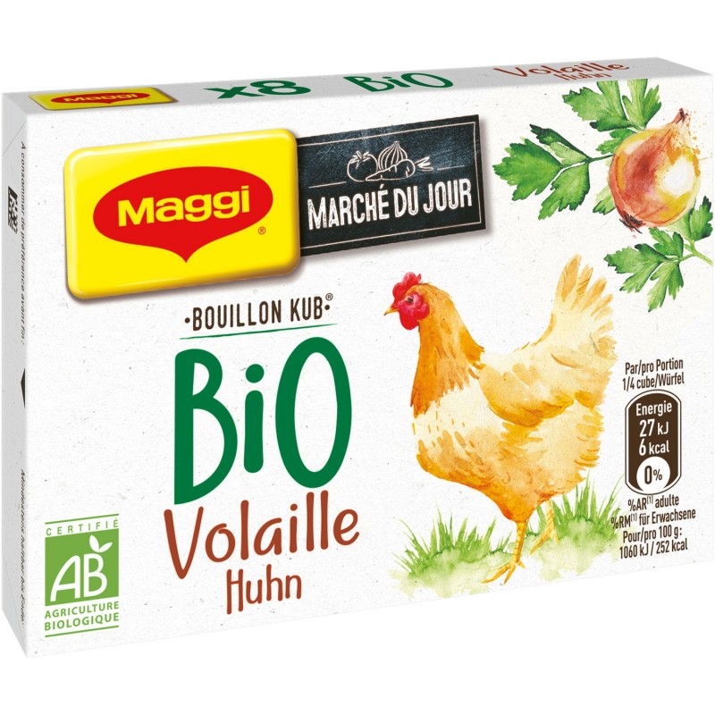 All kunnskapen til MAGGI Nå i ØKOLOGISK VERSJON! Gjenoppdag den deilige smaken av fjærkre i din lille terning i en ØKOLOGISK versjon! Med sin intense, kokte smak og utvalgte ingredienser av høy kvalitet, vil den være din allierte i alle dine daglige tilberedninger: pasta, ris, supper, gryteretter og andre wokreretter. Tips: Smuldre en kraft inn i marinaden laget med olje og sitronsaft før du dekker kyllingspydene eller escalope-ene med den.