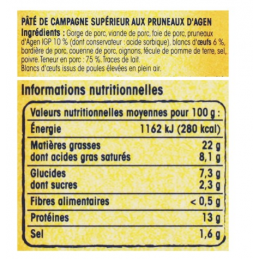 Ingredienser: Svinhals, svinekjøtt, svinelever, Agen-svisker PGI 10 % (inkludert konserveringsmiddel: sorbinsyre), eggehviter 6 %, svinefett, svinesvor, løk, potetstivelse, salt, pepper. Svinekjøttinnhold: 75 %. Eggehviter fra frittgående høner.