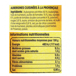 Forstekt aubergine 50 % (aubergine, solsikkeolje), tomatpuré 15 %, vann, løk 6 %, dobbeltkonsentrert tomatpuré 4 %, rød paprika 3,8 %, sukker, potetstivelse, hvitløk, extra virgin olivenolje 0,8 %, salt, konsentrert sitronsaft, solsikkeolje, aromatiske planter (inkludert herbes de Provence), pepper.