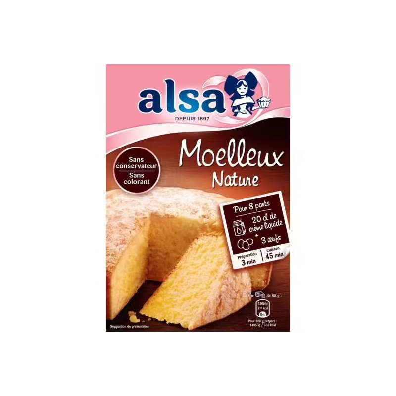 Alsa – Moelleux Nature 435g – Rask og enkel kakeblanding En generøs kake med en unik mykhet. Bare tilsett 20 cl kremfløte og 3 egg i blandingen, dryss over melis og sett den i ovnen før du gleder alle dine søtsuger. • En luftig tekstur for en utrolig myk kake; • En kake som gleder hele familien; • En enkel, rask og idiotsikker kake; • For 8 personer; • Ingen fargestoffer, ingen konserveringsmidler.