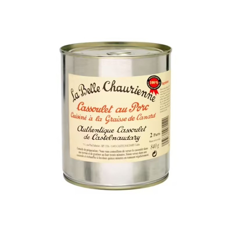 Lingotbønner 36 % - Vann - Grillede Toulouse-pølser 17 % (svinekjøtt og fett fra EU, vann, naturlig svinetarm, salt, pepper) - Svinekjøtt fra EU 13 % - Tomatpuré - Salt - Andefett 0,3 % - Hvitløk - Pepper. (% uttrykt ved bearbeiding).