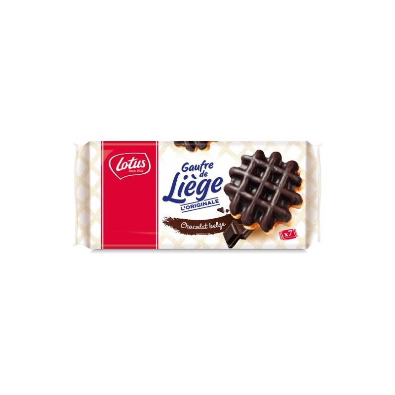 "Ofte imitert, aldri overgått ... vår utsøkte Liège-vaffel med ekte karamelliserte sukkerperler! Perfekt konservert i sin friskhetspose, naturell eller toppet med ekte belgisk sjokolade, er den rett og slett uimotståelig. Lotus-tipset: varm vaffelen opp igjen et par minutter i ovnen, den blir enda bedre."