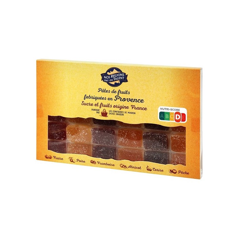 Sukker, fruktpuré 53 % (eple 36 %, pære 4,1 %, jordbær 3,8 %, kirsebær 2,5 %, fersken 2,3 %, bringebær 2,2 %, aprikos 2,1 %), glukosesirup, naturlig bringebærsmak, naturlig jordbærsmak, naturlig ferskensmak, naturlig pæresmak, naturlig kirsebærsmak, naturlig aprikossmak, geleringsmiddel: pektiner, surhetsregulerende middel: sitronsyre, antioksidant: askorbinsyre. Spor av gluten og nøtter.