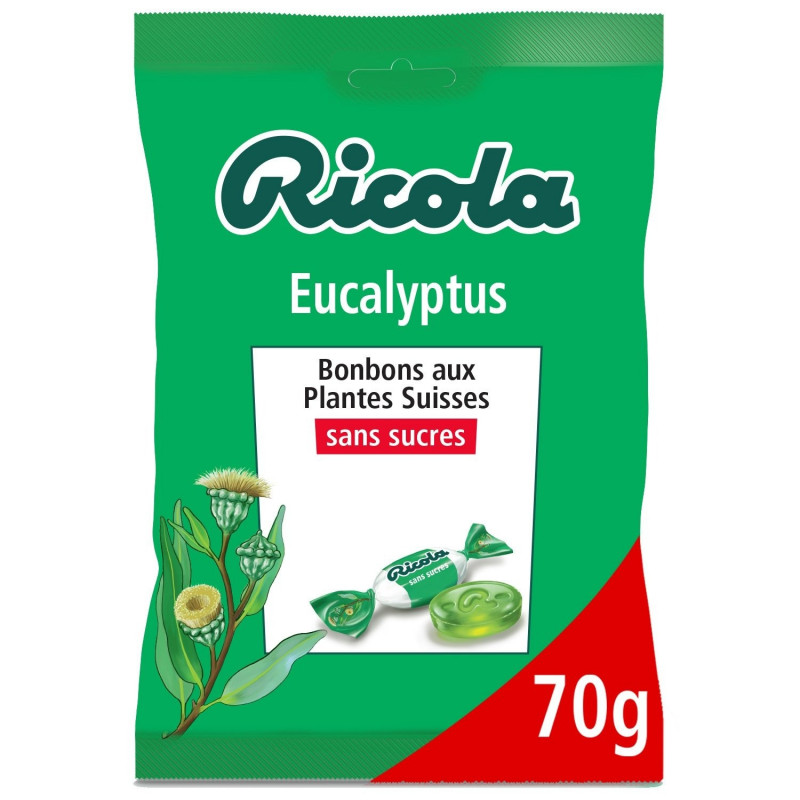 Ricola Eucalyptus Sockerfria Sötsaker kombinerar 13 växter från de schweiziska alperna med eterisk olja av eukalyptus och mentol för en behaglig hals*. *Mentol 188 mg per 100 g.
