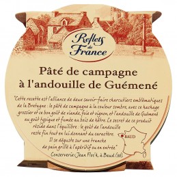 Överlägsen lantpaté med guémené andouille. Fläsk 41 %foie 33 %andouille 5 % (fläskgryta, salt, peppar), lök 7 %gras vetemjöl och stärkelse, salt, kryddor
